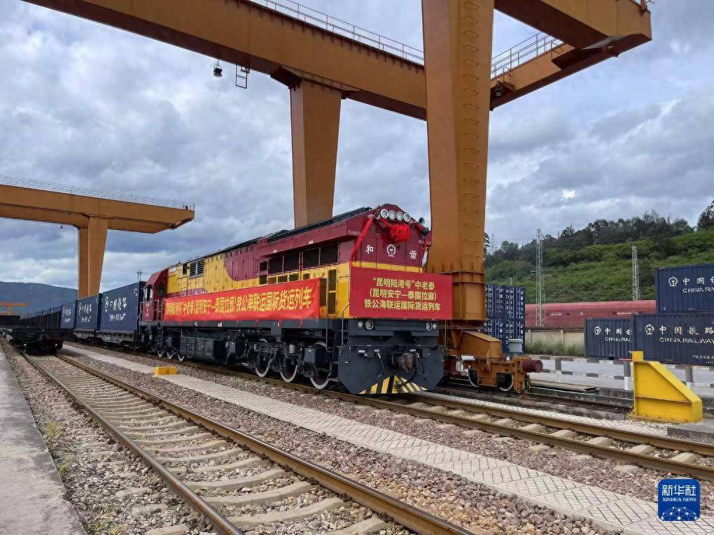 “昆明陆港号”铁公海联运国际货运列车从昆明国际陆港安宁北港桃花村货运站启程,通过中老铁路以公铁联运方式经泰国拉廊港,海运至缅甸仰光,全程预计用时10天,相比传统海运时间缩短了15天。