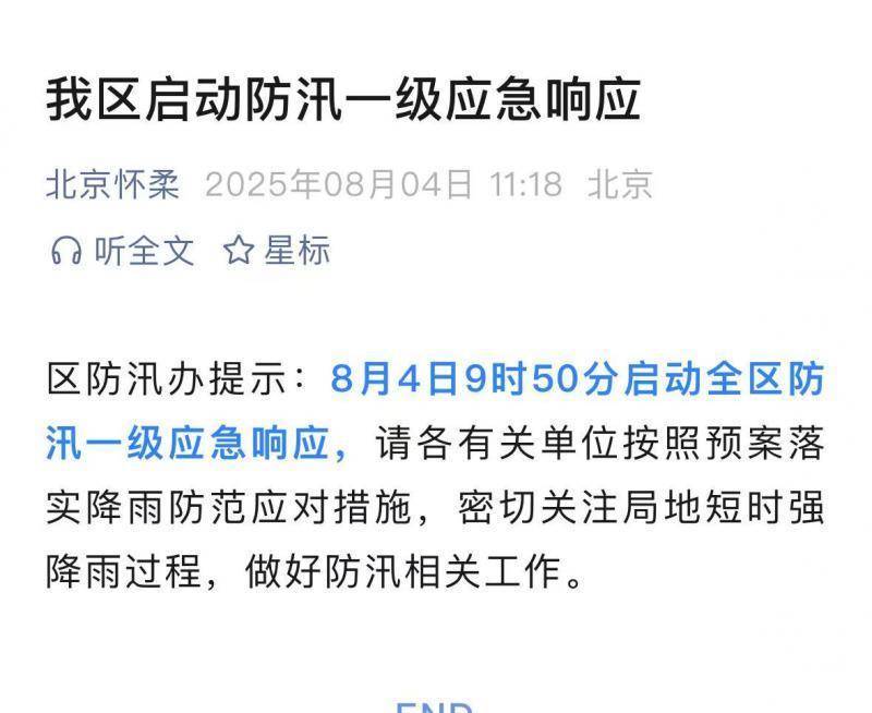 8月4日,怀柔区防汛办提示:8月4日9时50分启动全区防汛一级应急响应,请各有关单位按照预案落实降雨防范应对措施,密切关注局地短时强降雨过程,做好防汛相关工作。