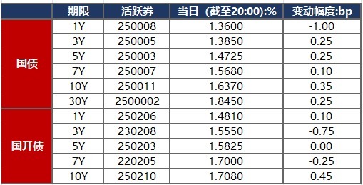 由于6月18日召开的陆家嘴论坛未宣布相关货币政策,债市全天以震荡为主。截至北京时间20:00,10年期国债活跃券250011收益率上行0.35bp至1.6370%,10年期国开债活跃券250210收益率上行0.45bp至1.7080%。