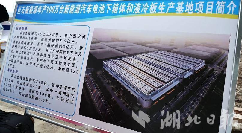 11月10日,在仙桃高新区,广西巨石新能源科技有限公司年产100万台新能源汽车电池下箱体和冷却板生产项目开建,计划总投资15亿元,首期投产后预计年产值达8亿元。