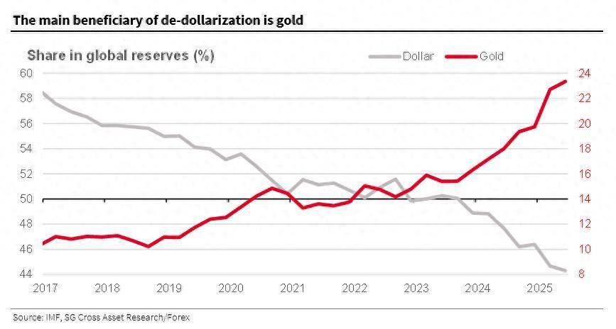 正如法国兴业银行图表所演示的,自2024年以来,去美元化进程并未如预期般使任何其他主要储备货币大为受益——在法定货币体系中,一种货币的损失本应会导致另一种货币获益。相反,黄金的份额在此期间则反而明显增加。