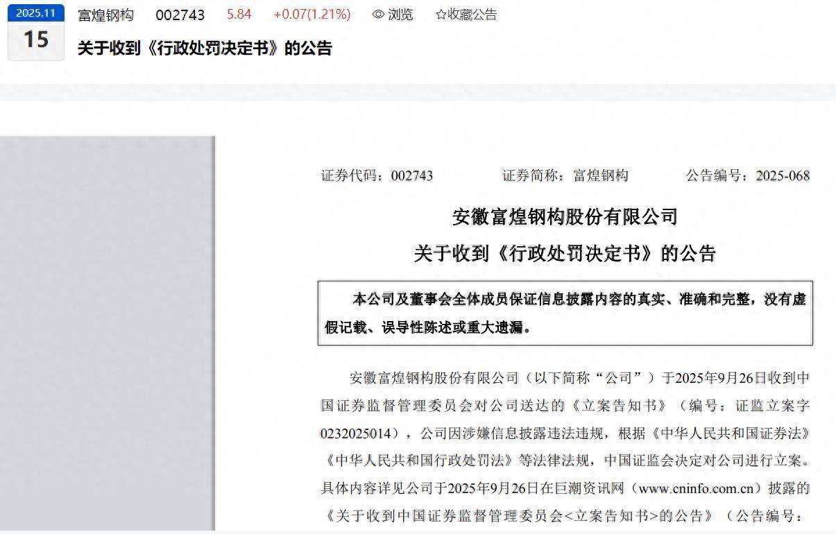 11月14日晚间,富煌钢构(002743)公告,公司及相关人员于2025年11月14日收到中国证监会安徽监管局出具的《行政处罚决定书》(〔2025〕5号)。