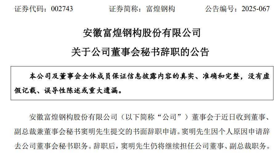欧陆娱乐11月14日晚间,富煌钢构还发布了公司董秘辞职的公告。公司董事会于近日收到董事、副总裁兼董事会秘书窦明提交的书面辞职申请。窦明因个人原因申请辞去公司董事会秘书职务。辞职后,窦明先生仍将继续担任公司董事、副总裁职务。截至本公告披露日,窦明未持有公司股份,亦不存在应当履行而未履行的承诺事项。窦明在任职期间恪尽职守、勤勉尽责,公司董事会对窦明为公司所作出的贡献表示衷心感谢!为保证公司董事会工作的正常运行,根据有关规定,在公司正式聘任董事会秘书之前,由公司董事兼总裁郑茂荣代为履行董事会秘书职责,公司将按照相关规定尽快选聘新的董事会秘书。